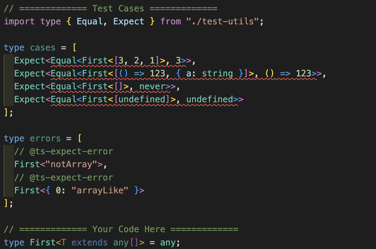 Expect<Equal<First<[() => 123, { a: string }]>, () => 123>>,